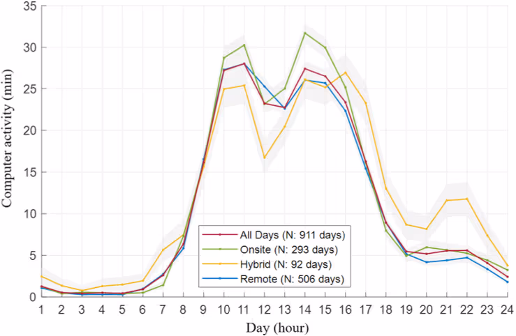 本研究では、勤務形態(リモート、オンサイト、ハイブリッド)によって、勤務リズムに違いが見られることが報告されています。