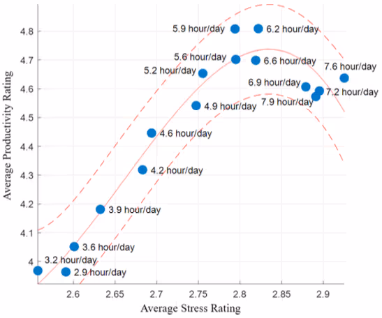 つまり、適度なストレスは生産性を向上させるが、過度なストレスや、ストレスが全くない状態は、生産性を低下させてしまう可能性があるということです。これは、 ヤーキーズ・ドットソンの法則 (Yerkes-Dodson’s law)とも一致する結果です。適度なストレスは、集中力やモチベーションを高め、パフォーマンスを向上させる効果がありますが、過度なストレスは、心身の健康を害し、作業効率を低下させる可能性があります。