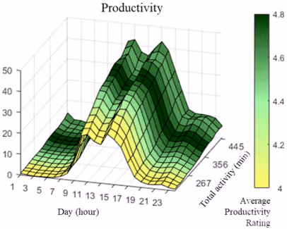 コンピュータアクティビティが少ない日は、生産性も低い傾向がありますが、コンピュータアクティビティが増えるにつれて、生産性も向上します。しかし、コンピュータアクティビティが約6時間を超えると、生産性は頭打ちになり、むしろ低下する傾向が見られました。