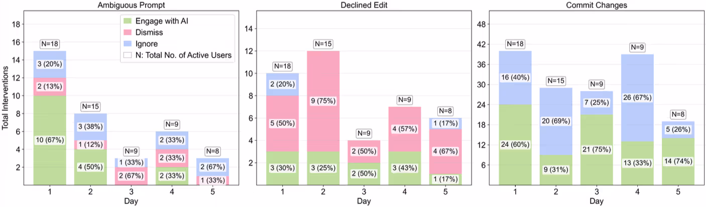 図表2:各開発段階におけるプロアクティブAI介入とのインタラクション率 左から「曖昧なプロンプト時」「編集拒否時」「コミット変更時」。コミット時(Commit Changes)のエンゲージメント(緑色)が最も高いことがわかる。